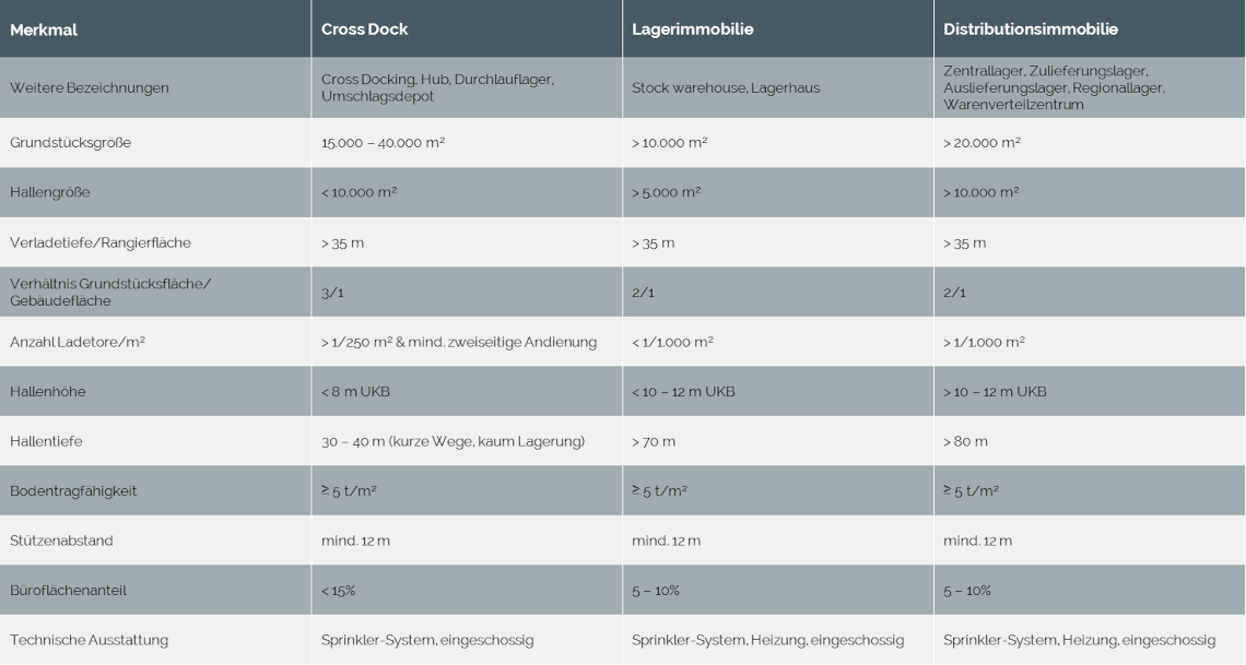 Die jeweiligen Immobilienarten weisen unterschiedliche bauliche Eigenschaften auf. Die in der Tabelle beschriebenen Merkmale können dabei als idealtypische Ausprägungen verstanden werden und gelten vor allem für moderne Logistikimmobilien.
